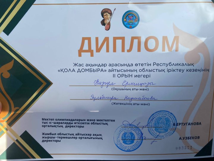 Жастар арасында айтыс өнерінің баға жетпес асыл мұра ретінде насихаттау, жан-жақты қолдау және дамыту мақсатында 2025 жылдың 16 қазан күні Тараз қаласында 10-18 жас аралығындағы мектеп оқушыларына айтыс өткізілді. Қазақстан РеспубликасыОқу-ағарту министрлігі, "Айтыс ақындары мен жыршы-термешілердің халықаралық одағы" республикалық қоғамдық бірлестігінің ұйымдастыруымен "Қола домбыра" республикалық жас ақындар айтысының облыстық кезеңіне мектебіміздің 10"А" сынып білім алушысы Ерланқызы Назгүл қатысып, жүлделі ІІ орынға ие болды. Құттықтаймыз!!