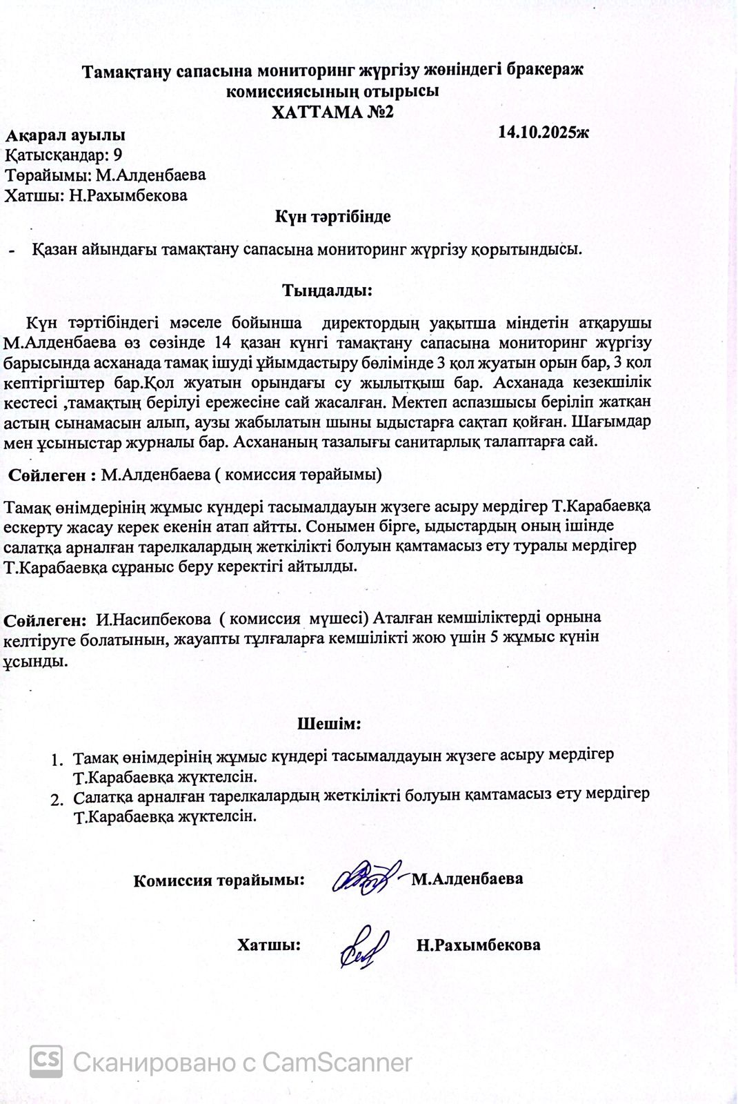 Бракераж комиссия отырысының хаттамасы » ОШГ№5 Акарал